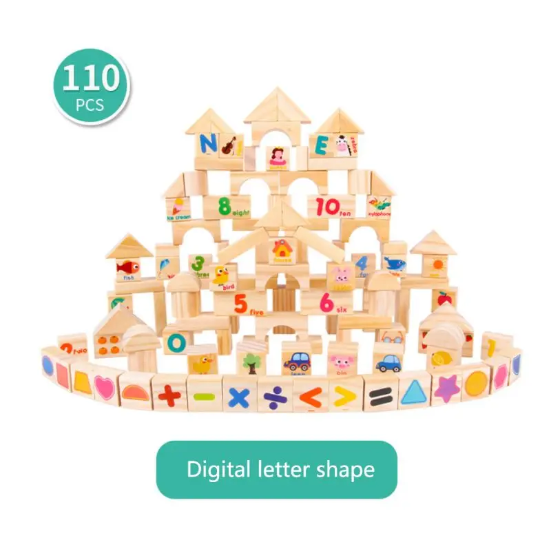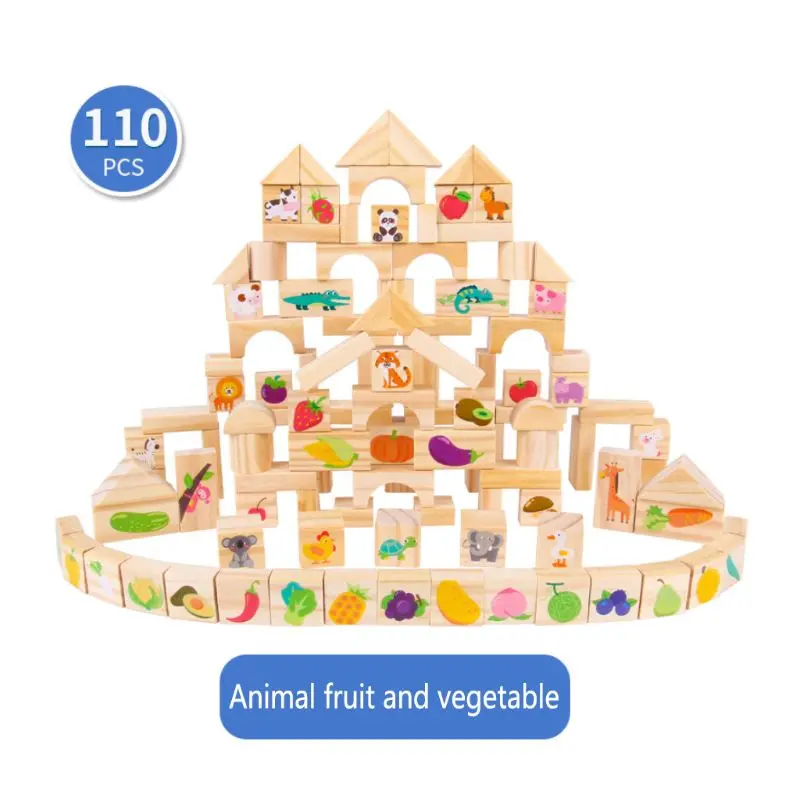 BEST 110pcs Wooden Building Block Stacking Alphabet Number Fruit Animals Assembling Puzzle Kids Children